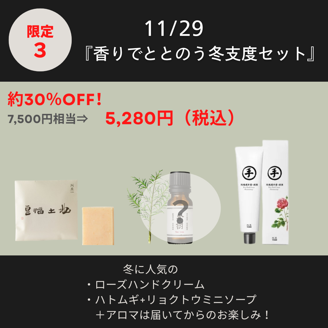 ミニソープ・アロマ・ハンドクリームの3点を詰め合わせた、冬の“香りでととのう”お楽しみセットです。