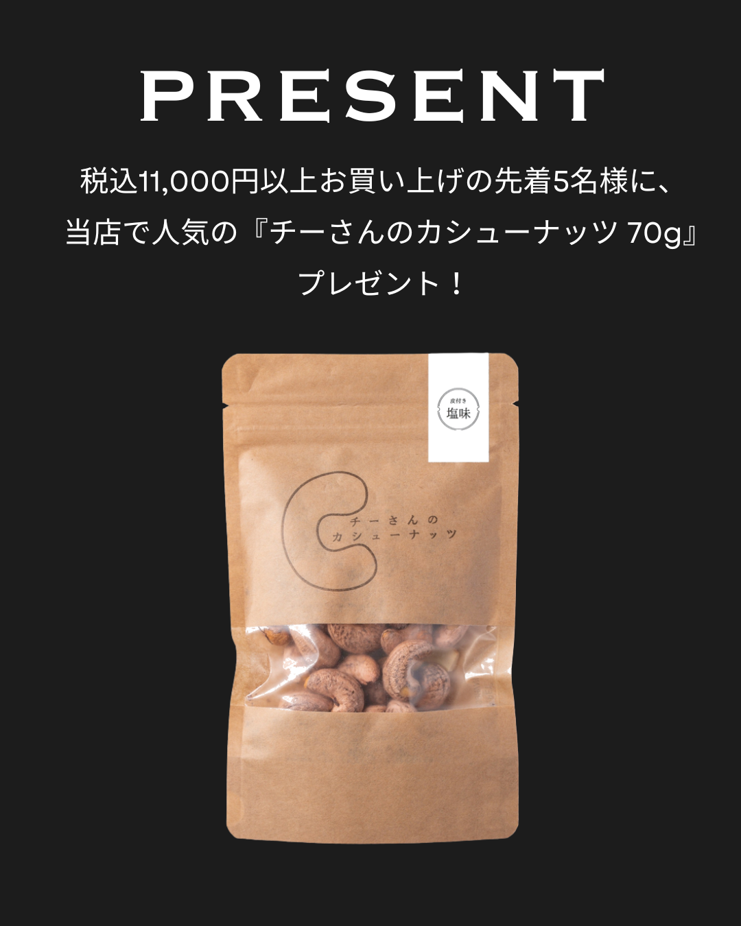 当店で人気の『チーさんのカシューナッツ 70g』をプレゼント!